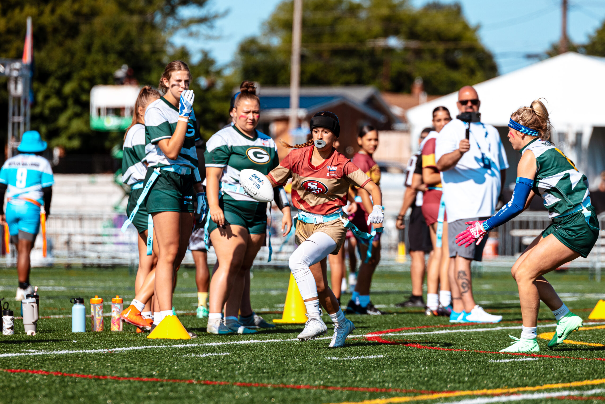 Tackling, blocking, and screening are prohibited. Instead, players wear flags that defenders must pull to end a play.